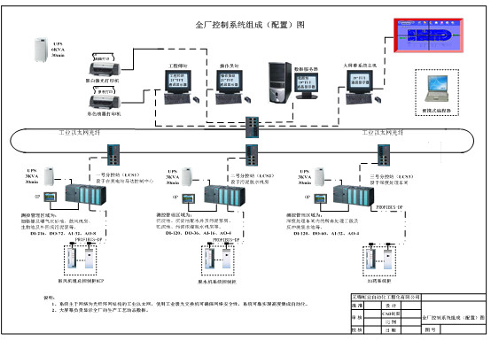 廠區(qū)中控室是整個(gè)人機(jī)信息交換中心,由2臺互為熱備數(shù)據(jù)服務(wù)器,客戶端操作計(jì)算機(jī)、DLP投影系統(tǒng)、打印機(jī)及UPS等構(gòu)成。主要把過程量信息集中化,把各個(gè)現(xiàn)場配置的測控站的數(shù)據(jù)進(jìn)行收集,并經(jīng)過簡單的操作完成過程顯示,各種圖形的展示,各種趨勢曲線的顯示和控制系統(tǒng)的生成等工作。自動(dòng)化控制系統(tǒng)設(shè)計(jì)遵從“集中管理,分散控制”的理念,由中央監(jiān)控系統(tǒng)(上位機(jī)/服務(wù)器)、現(xiàn)場設(shè)備控制站(PLC)網(wǎng)絡(luò)構(gòu)建,各層間具有相對獨(dú)立性,并通過千兆光纖工業(yè)以太網(wǎng)進(jìn)行數(shù)據(jù)交換。 廠區(qū)現(xiàn)場控制站(PLC)直接與各種傳感器,變送器和設(shè)備的電氣回路參數(shù)相聯(lián),負(fù)責(zé)轄區(qū)內(nèi)設(shè)備的控制、數(shù)據(jù)采集及PLC從站進(jìn)行通訊。現(xiàn)場的各種檢測儀表將各種水質(zhì)參數(shù)和物理量參數(shù)傳遞給現(xiàn)場控制單元,經(jīng)現(xiàn)場控制單元內(nèi)置程序計(jì)算后,控制相應(yīng)設(shè)備動(dòng)作,同時(shí)現(xiàn)場PLC單元將檢測量和控制量通過通訊系統(tǒng)傳給調(diào)度主機(jī),確保出水水質(zhì)指標(biāo)。對于異常工藝參數(shù),通過網(wǎng)絡(luò)及時(shí)向中控室發(fā)出報(bào)警信號,并根據(jù)中控室的指令進(jìn)行應(yīng)急處理。 主要工藝設(shè)備的控制均具有自動(dòng)、機(jī)旁手動(dòng)、人機(jī)界面手動(dòng)功能,充分考慮維修和維護(hù)的方便,讓工藝設(shè)備能平穩(wěn)地從工藝運(yùn)行中切入和切出?刂瞥绦蚓哂袊(yán)格的安全聯(lián)鎖,互鎖,確保設(shè)備生產(chǎn)安全運(yùn)行。 3.工藝流程圖及系統(tǒng)實(shí)現(xiàn)功能